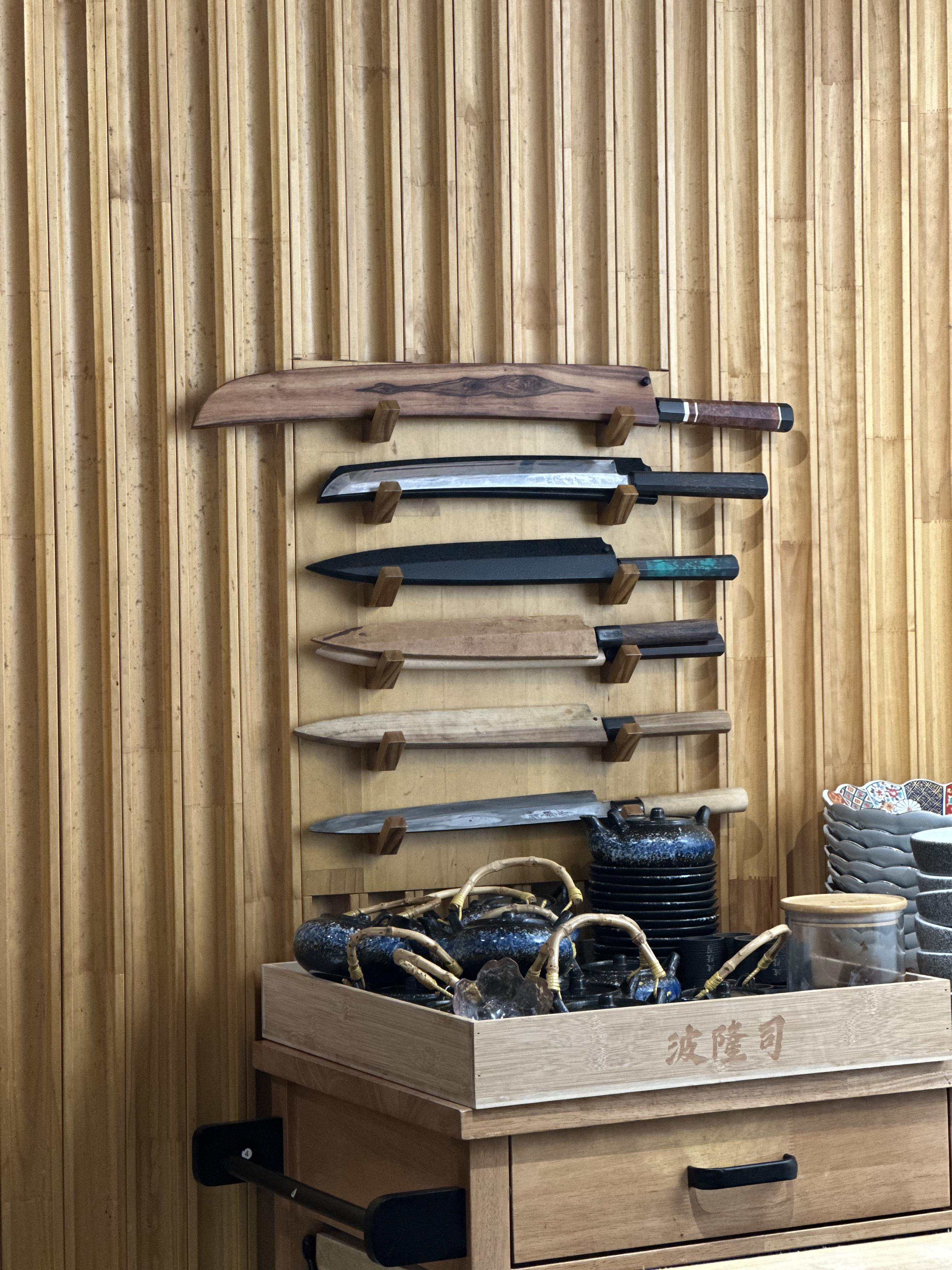 그런데 이날은 앉은 위치 때문인가 바로 앞 벽에 걸린 칼들이 눈에 들어왔다. 스시 셰프에게 가장 중요한 도구를 꼽자면 아마 칼일 거다. 좋은 재료를 구하면 이를 잘 손질해서 손님 앞에서 꺼내 마지막 썰어내기에 좋은 크기로 준비하고, 마지막 세밀한 손놀림과 함께 최적의 모양과 크기로 잘라내어 하나의 초밥이나 회를 이용한 요리를 완성하는데 데 칼만큼 중요한 도구는 없을 거다. 큰 참치 등을 다룰 때 쓰는 양날을 가진 큰 칼부터 세포의 손상까지 고려해서 빠르고 선명하게 부드러운 횟감을 잘라낼 때 쓰는 가늘고 날카로운 칼까지, 내가 잘 모르지만 아무튼 여러 용도에 쓰일 것 같은 크기와 특징을 가진 칼들이 잘 손질되어 준비되어 있는 게 보였다.